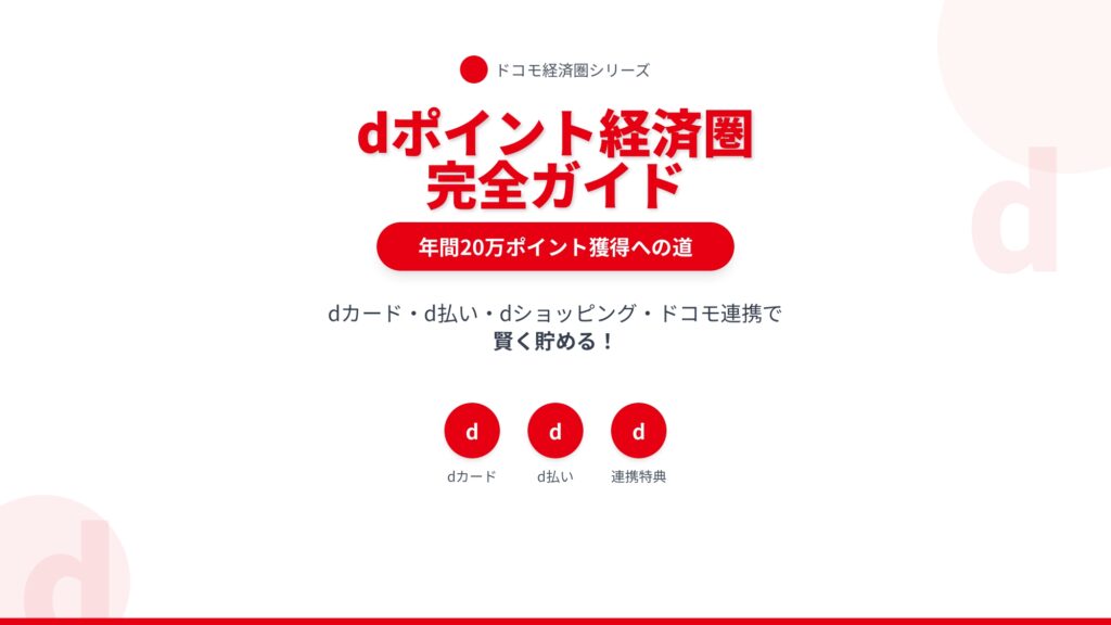 メタディスクリプション: dポイント経済圏の始め方を4つのステップで完全解説。dカード・d払い・ドコモ連携で年間20万ポイント獲得も可能。具体的な戦略と注意点まで徹底ガイド。 毎月の支払いや買い物でポイントを貯めているも … 続きを読む dポイント経済圏の始め方完全ガイド【年間20万ポイント獲得への道筋】