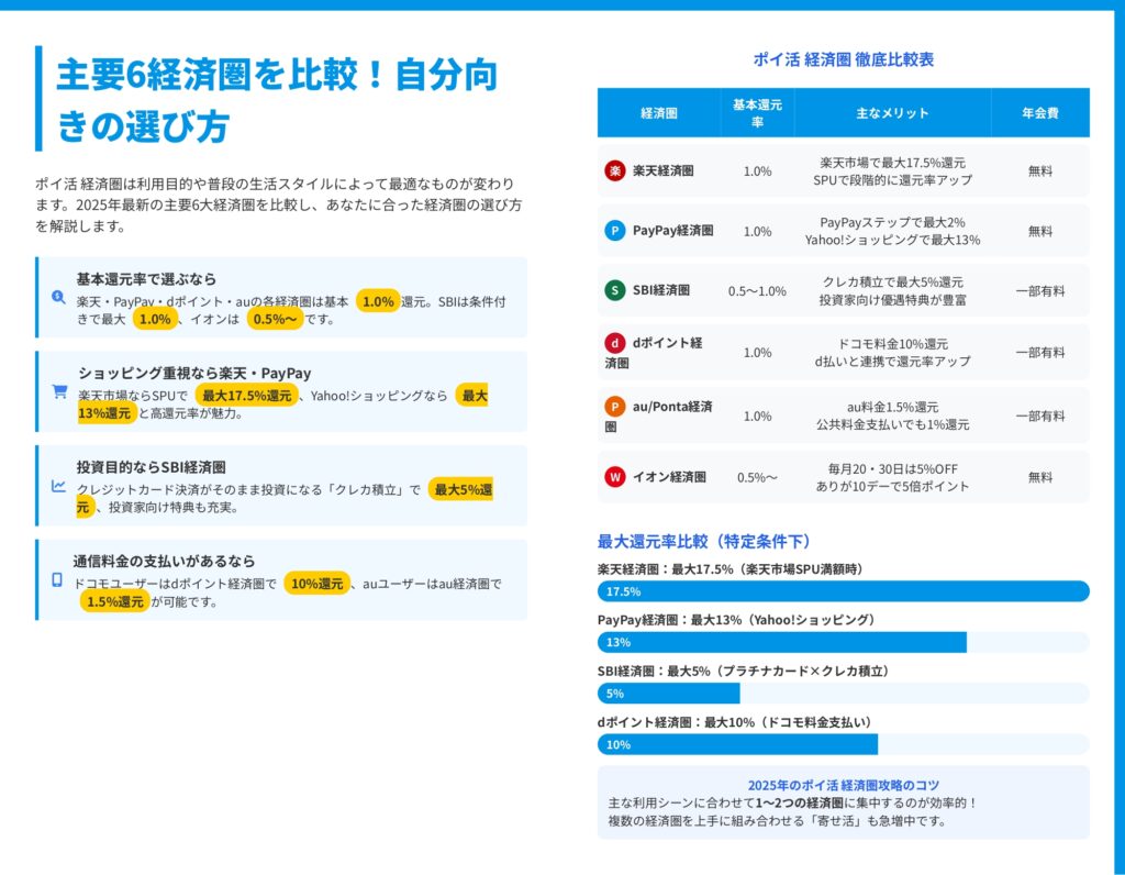 この記事では、ポイ活 経済圏の基礎知識から、主要6大経済圏(楽天・PayPay・SBI・dポイント・au・イオン)の徹底比較、さらには家族構成別のシミュレーションまで、初心者でも今日から実践できる情報を完全網羅してお届けします。新NISA活用による資産形成の加速方法も解説しますので、ぜひ最後までご覧ください。