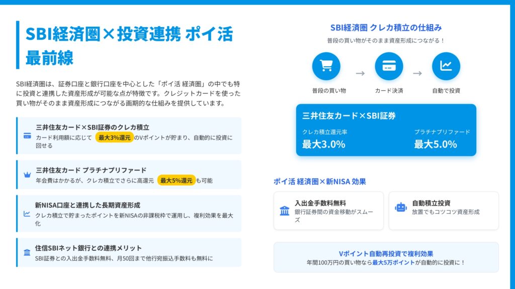 SBI経済圏の最大の特徴は、普段の買い物がそのまま資産形成につながる仕組みです。三井住友カードを使った買い物で貯まるVポイントが自動的に投資に回せるため、「ながら投資」が実現できます。