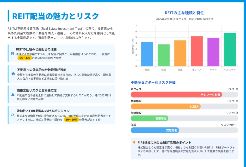 REIT配当は安定性が高い一方で、価格変動リスクと金利感応度に注意が必要です。不動産市況や金利上昇に連動して価格が変動するリスクがあり、特に2025年は金利動向を注視する必要があります。