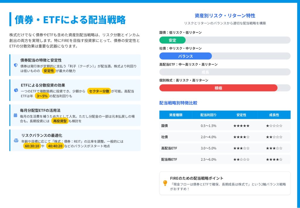 FIREポートフォリオにおいては、「現金フローは債券とETFで確保、長期成長は株式で」という2軸バランス戦略が効果的です。