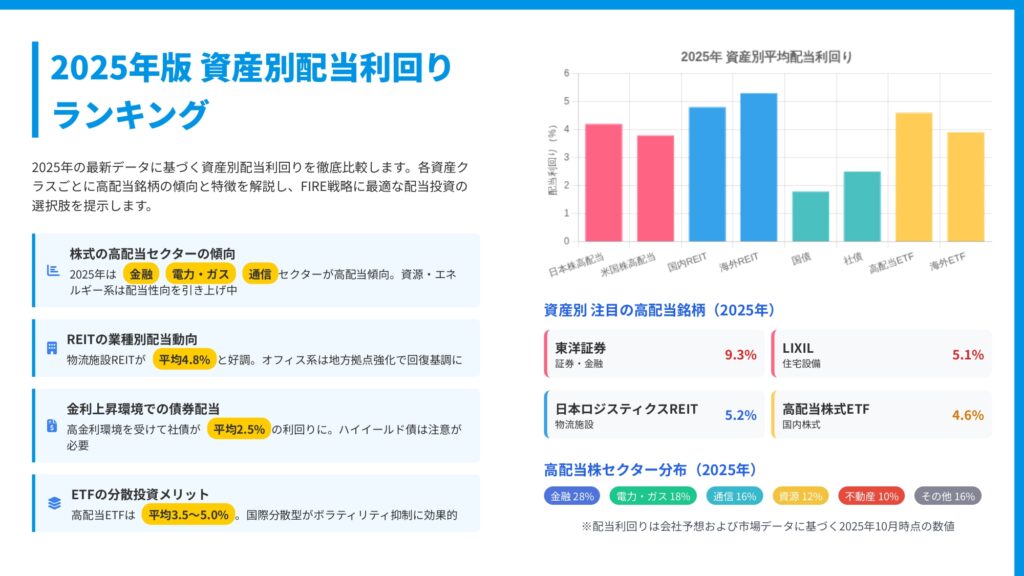 本記事では、株式・REIT・債券・ETFという4つの主要資産について、配当利回りの違いやリスク特性を徹底比較します。年間300万円の配当収入を実現するために必要な資産額の計算方法から、2025年最新の高配当セクター情報、新NISA制度を活用した税効率の高い運用法まで、実践的な配当投資戦略をお伝えします。資産別配当の特徴を正しく理解し、あなたのFIRE達成を加速させましょう。