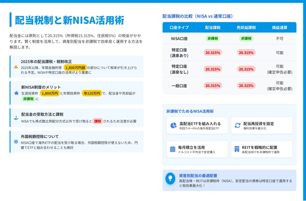 税効率を最大化するには、高配当株・REITは非課税枠(NISA)で運用し、安定配当の債券は特定口座で運用する戦略が効果的です。