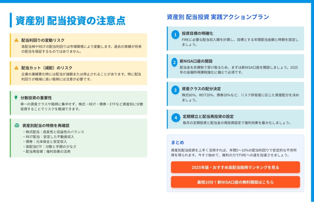 2025年は金融所得課税強化や金利動向の変化が予想されるため、資産別配当戦略の見直しが特に重要です。今すぐ始めて、複利の力でFIREへの道を加速させましょう。