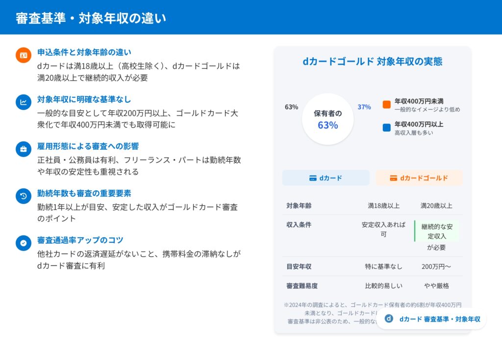 年会費無料のdカードと、年会費11,000円(税込)のdカードゴールド。一見すると年会費無料のdカードの方がお得に見えますが、実はゴールドカード保有者の約63%が年収400万円未満という調査結果があり、ゴールドカードは思っているより身近な存在になっています。